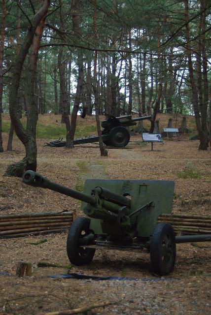 Jechaliśmy spory kawałek wzdłuż wałów Wiślanych i spotkalismy dziwne metalowe ustrojstwo na brzegu. Chyba tam kiedyś były jakies znaki, ale zupełnie zardzewiało i nic nie widać. Po paru przydrożnych cmentarzach i kwaterach wojennych dojechaliśmy do perełki dnia czyli skansenu militarnego pod Magnuszewem, w malowniczym sosnowym lesie. Meteor już tu był, więc na spokojnie zajął się centrowaniem koła (obręcz pęknięta i koło ma się coraz gorzej), a ja poszłam zwiedzać. Czołg znalazłam przypadkiem, dobrze schowany. Oprócz tego dużo różnego innego dobra, na którym się nie znam. Spodobało mi się coś amfibiopodobne i... nowy budynek muzeum, który dość dobrze wpisuje się w moje bunkrowe gusta. I jeszcze zrobili żwirkowy taras widokowy na dachu. Świetny pomysł! Niestety jest jeszcze nieczynne, ale za to w domku-kasie obok można dostać pyszne lody na patyku, coś za coś. Ponoć ekspozycja muzealna powinna sie otworzyć do przyszłych wakacji (gromadzą eksponaty).