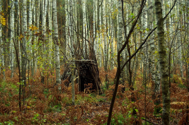 Dziś pojechaliśmy do naszego pierwszego szałasu, który nieznana nam ekipa rozbudowuje. Okazało się, że znów dobudowano kawałek, tym razem płaski. Ale konstrukcja była spróchniała i czuję, że trzeba będzie postawić to na nowo, bo zimy nie przetrzyma.Tomi i Kluska słuchają, jak dzięcioł stuka w drzewo. Potem jeszcze znalazłyśmy inne stukające drzewo.